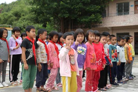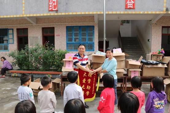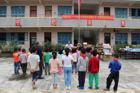 早上九点,我们带着一如既往的初心从公司楼下出发, 从广州前往肇庆广宁县石咀镇。经过连续不断的蜿蜒山路,三个多小时后我们到达了石咀镇。石咀镇,这个我们来了三年的地方,感觉是那么的熟悉,从镇上到周围的村庄都能看到小学生的身影。为了不打扰学生休息,我们选择下午14:00到达建中小学。此时已经有学生陆续返校,见我们到来,学生们打开了校门,不约而同喊着“欢迎欢迎”,脸上洋溢着欢欣的笑容。建中村委、建中小学的校长、老师以石咀镇中心小学校长及副校长及学生们已集中等候,公司购买的打印机、书包、校服、体育用品、学习文具以及图书均摆放在教室门口的红旗下。根据学校的安排,现场举办了简单而有意义的捐赠仪式,为感谢公司的捐助,校长还赠送了 “大爱无疆,捐资助学” 的锦旗。